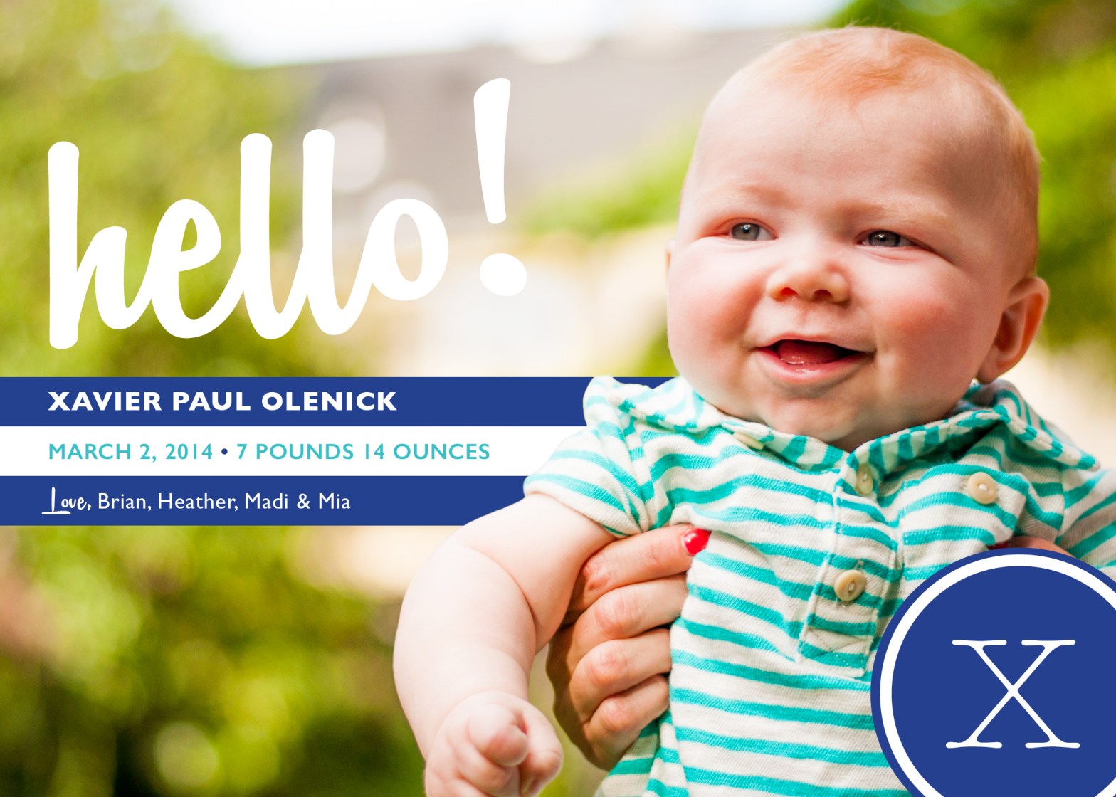 Design and Photography: Welcome Xavier Posted bykarencookSeptember 23, 2014November 29, 2018Posted inAnnouncements/Invitations, Design, Photography, PortraitsTags:announcements, babies, birth announcement, customized design, design, family photography, photography Xavier_Announcement_Final Share this: Click to share on X (Opens in new window) X Click to share on Facebook (Opens in new window) Facebook Click to share on Pinterest (Opens in new window) Pinterest Click to email a link to a friend (Opens in new window) Email Like Loading... Related